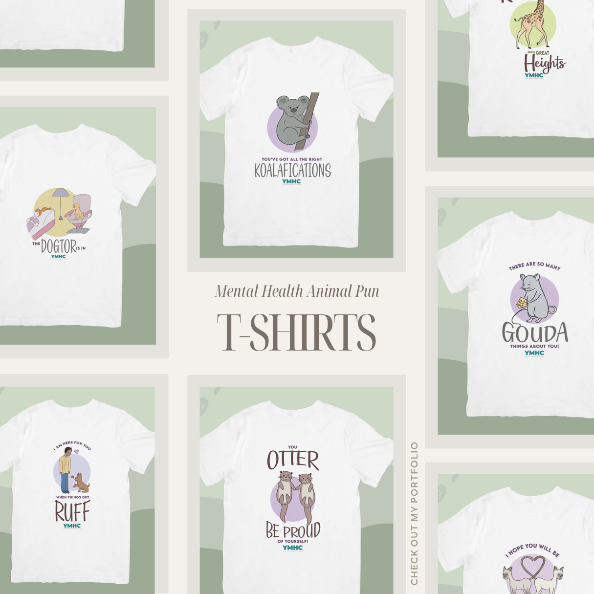 介绍 YMHC 迷人的“ 心理健康动物双关语 T 恤”系列 - 一个令人愉悦的系列,旨在带来微笑和传播正能量!每件 T 恤都配有温馨的双关语和可爱的动物插图,完美地融合了幽默和对心理健康意识的支持。